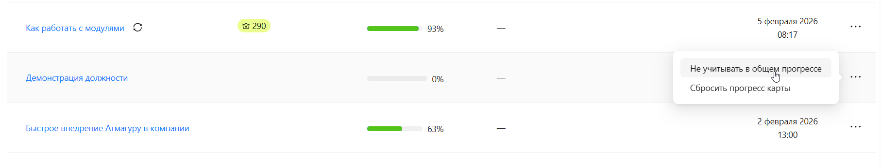 Все модули карты для пользователя станут доступны. Однако прогресс обучения по такой карте не будет учитываться в общем прогрессе.