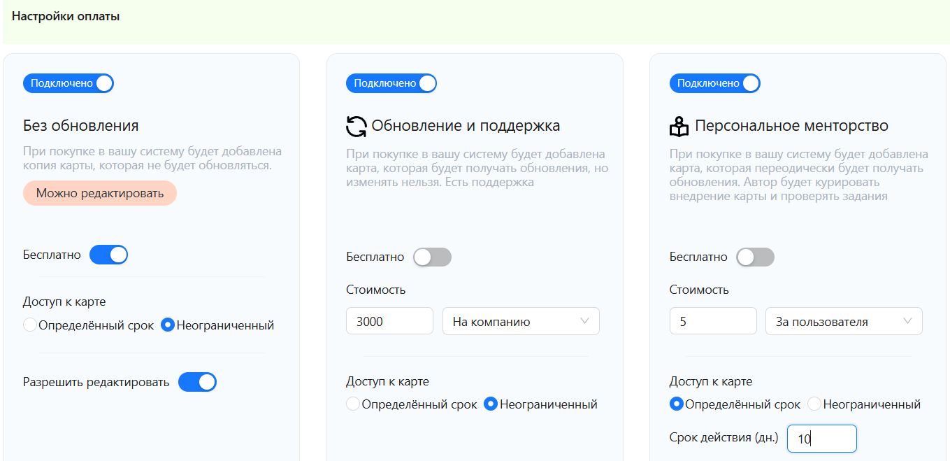 - Персональное менторство — карта получает обновления, автор сопровождает внедрение и проверяет задания, редактировать нельзя.